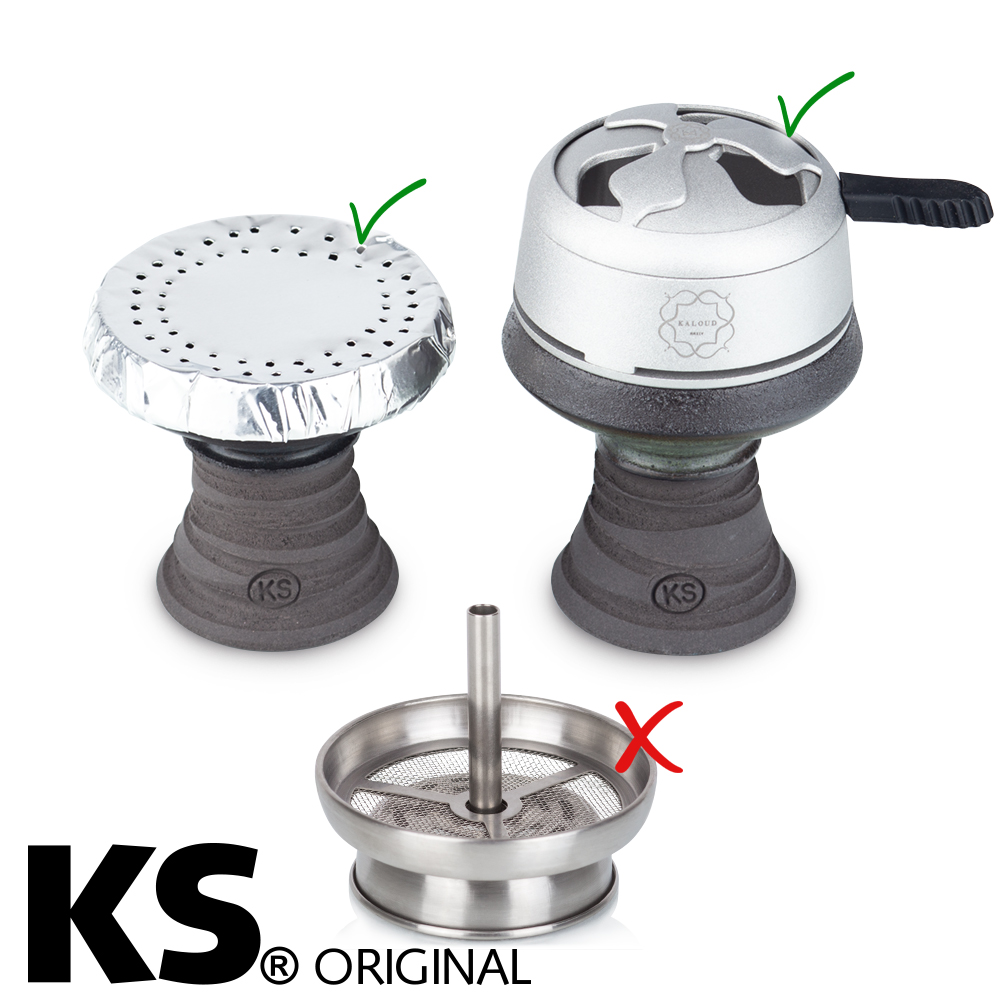 Den Kopf kann man mit Alufolie und Kaloud/Smokebox (Kaminaufsatz passt nicht!) benutzen. Bei der Alufolie empfehlen wir, die Luftlöcher am äußeren Rand zu stechen, um die Hitze optimal zu lenken (siehe Bild). Weiterhin empfehlen wir einen Einlegesieb, damit die Löcher nicht mit Tabak verstopft werden.