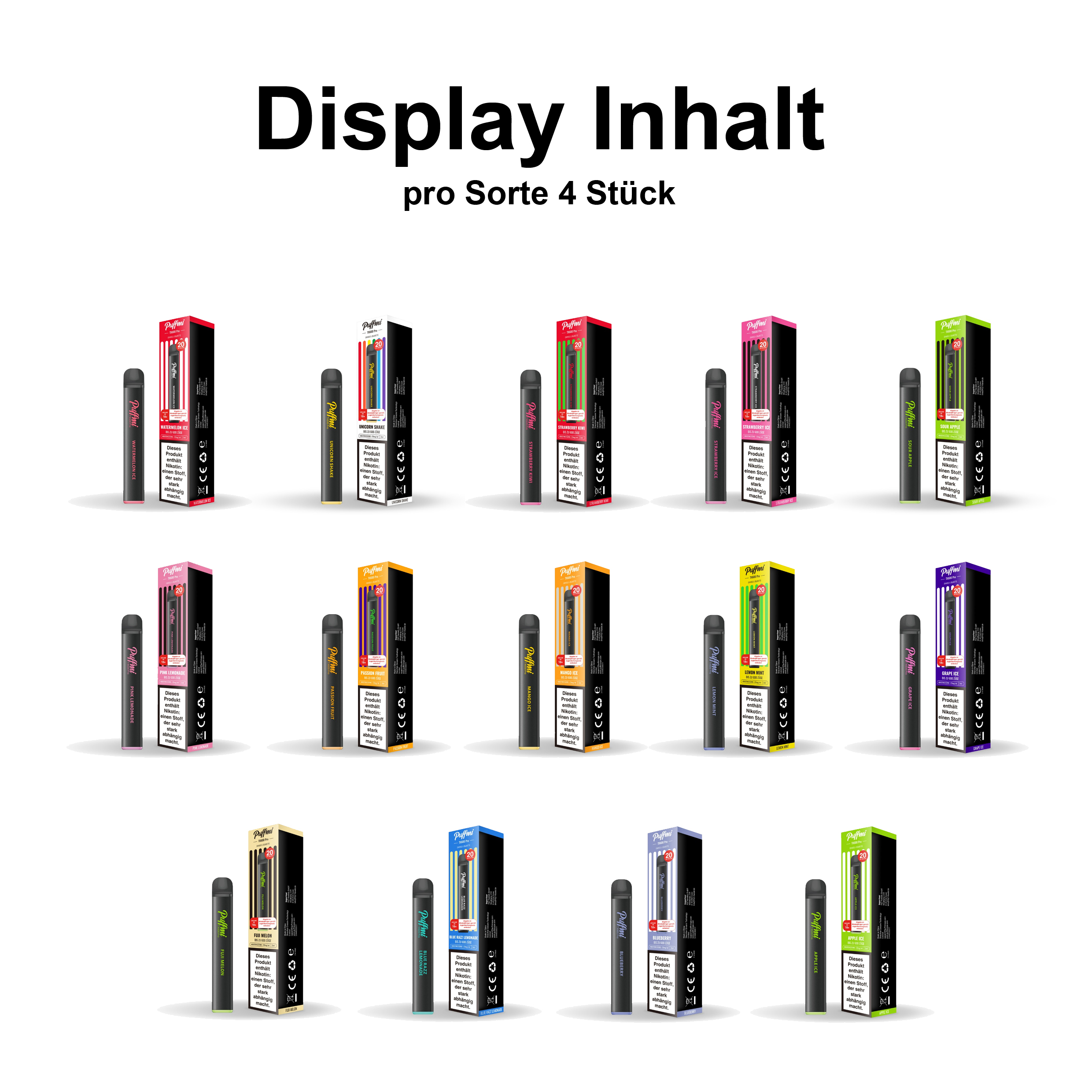 Es sind insgesamt 56 Vapes, 4 Stück von 14 Sorten.